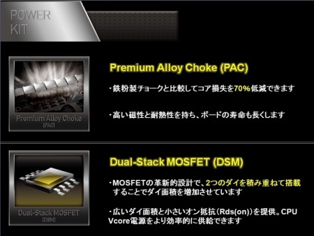 | 「Premium Alloy Choke」や「Dual-Stack MOSFET」など電源周りのコンポーネントには高品質なものが採用される | |