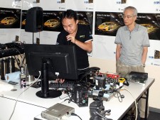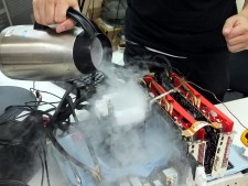 | 「Z77 OC Formula」の設定を解説しながら行われた、液体窒素によるオーバークロックパフォーマンス。オーバークロッカーのFred Yama氏(右)も作業に参加 | |