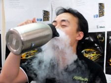 | 「Z77 OC Formula」では極冷用プロファイルがあらかじめ用意されているため、僅かな時間で5.828GHzの高クロックを達成(左)/オーバークロック実演中には液体窒素を口に含むパフォーマンスも披露してくれた(右) | |