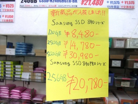 SAMSUNGのSATA3.0対応SSD「SSD 840 Pro」シリーズの発売が本日より開始された。在庫を確認したのはパソコンハウス東映とツクモパソコン本店でいずれも容量は256GBモデルのみ。なお販売価格はパソコンハウス東映が税込22,480円、ツクモパソコン本店が20,780円。