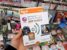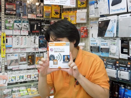 最近は微妙なスタイルで写真に収まるのがお気に入り、パソコンハウス東映の中村さんがコレオシしてくれるのは「Eye-Fi Pro X2 16GB Class10」。14日から発売が開始された無線LAN機能搭載SDカードの決定版だ。もうスマホとカメラの距離はこんなに近くなっていたなんて・・・