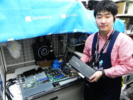 コレオシでもお馴染みのツクモパソコン本店スタッフ岩澤さんが組み立てていたのは、Supermicro製のデュアルXeon対応LGA2011ラックマウント型サーバーベアボーン「1027GR-TRFT」と、さらにNVIDIA Tesla K20を2枚搭載したハイエンドマシン。「だいぶ前から受注していたものなのですが、ようやく製品が入荷したので組み始めたところです」という。