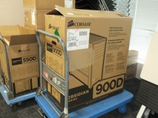 | 本体両サイド下には「スイングアウトドア」による開閉式。2.5/3.5インチシャドウベイは3台ずつ設置場所を組み替えることができる | 会場脇にあった収納用ダンボール。となりの「550D」用と比較するとその大きさがよく分かる |