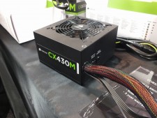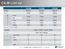 続いて紹介されたのは奥行を140mmに抑えた80PLUS BRONZE認証電源「CX SERIES」シリーズ。ATX 24pin+CPU 8pinを直結式、それ以外を着脱式にしたセミプラグイン仕様で、MicroATXサイズや省スペースPCでも、エアフローを妨げることなく組み込むことができる。さらに、このクラスでは珍しい120mmファンを搭載しており、静音性と冷却性能が高いのが特徴とされる。