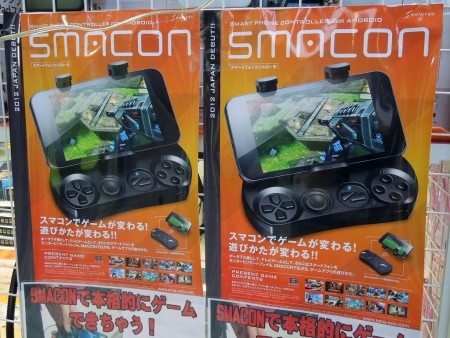 「さぁて今日のオススメはスマートフォン用コントローラ、略して『SMACON』(スマコン)!私もテストと称して色々いじり回してみましたが、とにかく簡単なのが善哉。通常この手のBluetoothコントローラって、アプリで色々設定が必要な玄人向けアイテムが多いですよね?でもそれじゃあ皆が気軽に遊ぶのは厳しい。そこでコイツの出番ってワケですよ。国内メーカー品なのでマニュアル等も充実、でもいちいち説明読まなくてもスンナリ使えちゃうのが一番いいところですね。