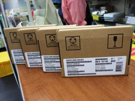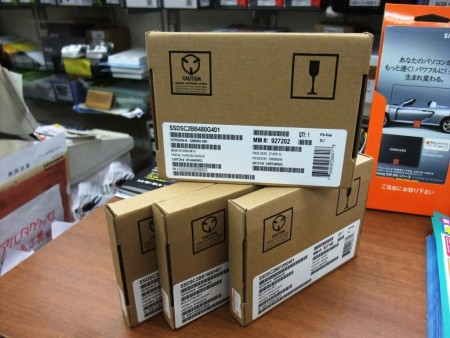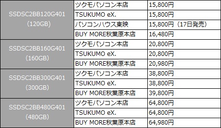 詳細スペックは不明ながら、NANDフラッシュは20nmプロセスのMLCタイプを採用。転送速度はシーケンシャル読込450MB/sec、書込400MB/sec、4Kランダム読込72,000 IOPS、書込10,000 IOPSとされる。なお今回入荷を確認したのは「SSDSC2BB120G401」(120GB/TBW70TB)、「SSDSC2BB160G401」(160GB/TBW100TB)、「SSDSC2BB300G401」(300GB/TBW170TB)、「SSDSC2BB480G401」(480GB/TBW275TB)の4機種で、販売ショップと価格は以下の通り。