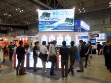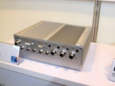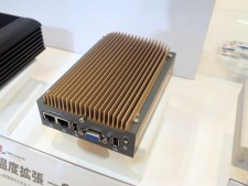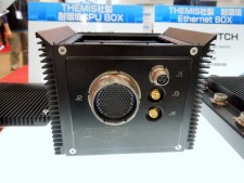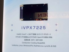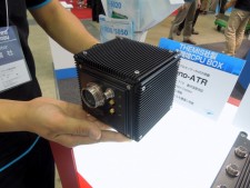 イノテック株式会社のブースでは、手のひらにも乗るThemis Computer(本社:アメリカ)製の小型モデル「Nano-ATR」を展示中。-40~71℃の温度拡張に対応するほか、「MIL-STD-810G」と「MIL-STD-461F」の軍事調達規格に準拠する。PCI-Express接続のメインボードに「VITA-74」規格のI/Oモジュールを接続する仕様で、モジュールは4スロット分が実装可能だ。CPUはIntel Atom N455(1.66GHz/TDP6.5W)が搭載されている。