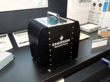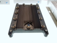 | 台形上の筐体の左右にヒートシンクが並ぶEmerson Electric製の「VPX-3000」。先ほどよりは大柄ながら、PC自体をモジュールのように組み込む仕様のため重さは5kg程度だという | |