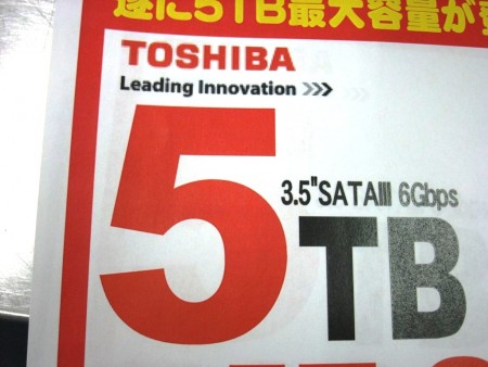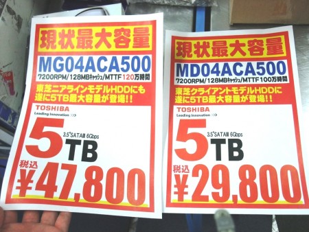 東芝から、ヘリウムガス充填型以外のHDDでは最大となる、容量5TBの3.5インチHDD 2種の発売が開始された。磁気記録層とヘッド機能の改善により、ディスクあたり最大1TBを実現した高密度モデルで、高耐久なニアライン向け「MG04ACA500」と、クライアント向け「MD04ACA500」の2種類がラインナップされる。