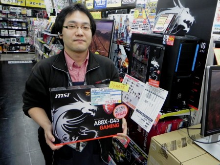 MSIをこよなく愛するという、ツクモパソコン本店スタッフ上田さんも心待ちにしていたKaveri対応のゲーミングマザーボード、MSI「A88X-G45 GAMING」の販売が8日(土)よりスタート。好調なセールスを記録中だという。