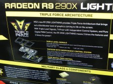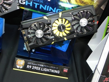 まず目を引いたのが、MSIのOC向けグラフィックスカード「LIGHTNING」シリーズの新モデルでRadeon R9 290X搭載の「R9 290X LIGHTNING」だ。VGAクーラーには、個別に回転数を調整できるトリプルファンクーラー「TriFrozr」を装備。軍事調達規格「ミリタリークラス4」準拠のほか、オーバークロック耐性を高めるために用意された12層PCBのオリジナル基板。電源回路にはGPU 12フェーズ、メモリ3フェーズの15フェーズ回路が実装され、8pin×2、6pin×1の補助電源コネクタを備える。