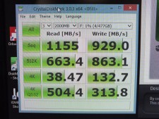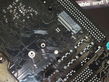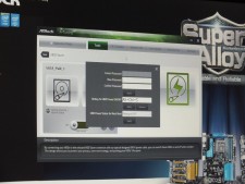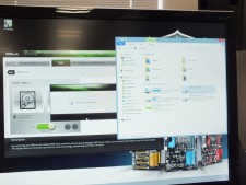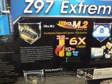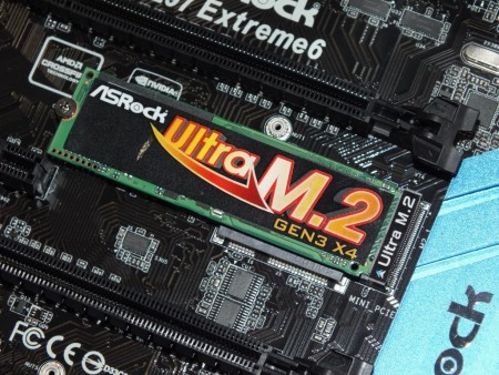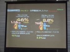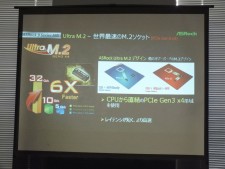 理論値でSATA3.0(6Gbps)の6倍の帯域幅を誇る「Ultra M.2」スロット。会場に用意されたデモ機では、シングルドライブで1,000MB/secを超えるスコアを叩きだしていた | |