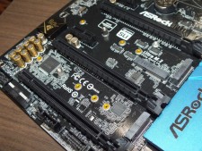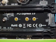 PCI-Express3.0(x16)の間にはM.2スロット(10Gbps)を搭載。マルチグラフィックスは2-Way NVIDIA SLI/3-Way AMD CrossFireXに対応する | |