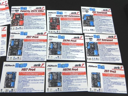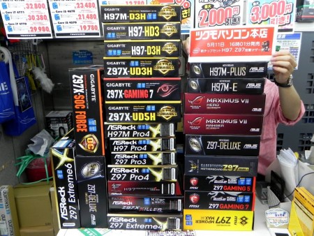 5月11日(日)16:01から販売解禁されるIntelの新型CPU「Haswell Refresh」および「Intel 9 Series Chipset」搭載マザーボード。各ショップには、前日の10日になって大量のマザーボードが入荷。ポップ製作などの準備作業も一苦労といった様子だった。