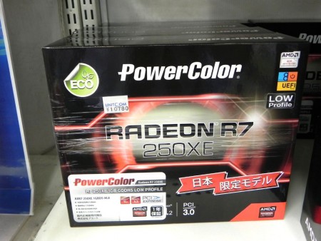 最大のネックは価格でしょう。1万円オーバーという価格設定ですが、ほら見てください。すぐ後ろを向くと、上位のRadeon R7 250X搭載モデルが7,280円で売っているという・・・。自業自得と言われればそれまでなのですが、1スロットでLowProfile、補助電源なしという点は評価して欲しいところです。