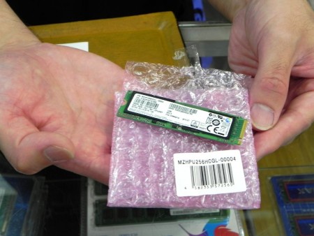 PCI-Express2.0(x4)対応M.2 SSD、SAMSUNG「XP941」シリーズの注目度が上昇中だ。先日デビューしたIntel X99 Expressチップセット搭載マザーボードの多くでは、PCI-Express2.0(x4)対応のM.2スロットを実装するためで、ZOA秋葉原本店でも最近になって再び売れ始めているという。