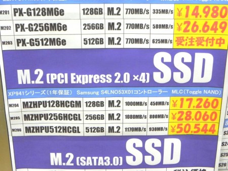 「しばらく売れ行きが落ち着いていたSAMSUNGのM.2 SSD『XP941』シリーズですが、X99搭載マザーボードと同時購入されていく方が結構いましたね。今までは、ASRock『Z97 Extreme6』のUltra M.2スロットくらいしか、パフォーマンスを引き出せませんでした。それが、多くのX99搭載マザーボードでPCI-Express2.0(x4)対応のM.2スロットが実装されましたので、これは大きいですよ。