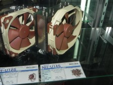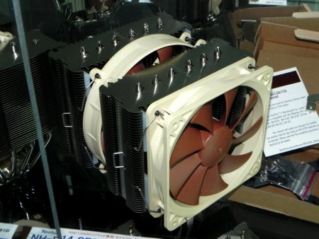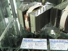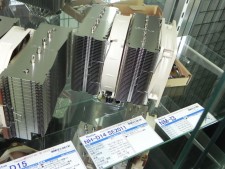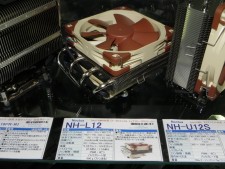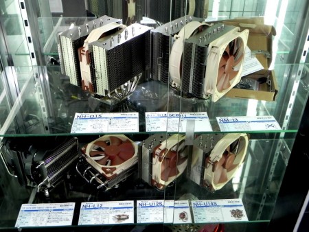 展示されているのは、サイドフロー型CPUクーラーのフラッグシップモデル「NH-D15」と「NH-D14」、トップフロー型CPUクーラー「NH-L12」、メモリ干渉を回避させたサイドフロー、Noctua「NH-U12S」と「NH-U14S」の5製品。形状もさまざまなCPUクーラーを、一堂に見比べる事ができる。