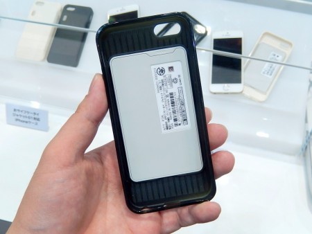 | カードとカバーケースがセットになった「おサイフケータイジャケット」。中のカード型ユニットが本体で、バッテリーは2.5ヶ月ほどもつようだ |