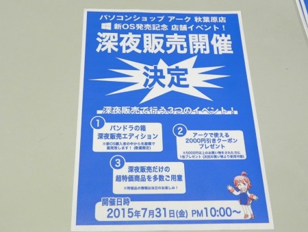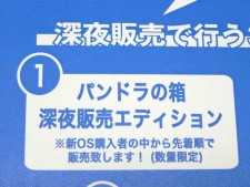 用意されたPOPによると、31日(金)の深夜販売は20時に閉店後、22時に再度オープン。3つのイベントとして、新OS購入者が先着で購入できる「パンドラの箱」(深夜販売エディション)を販売するほか、5,000円以上の買い物で次回購入時に使える「2,000円引きクーポン」の配布、深夜販売だけの超特価品の販売を行うとしている。