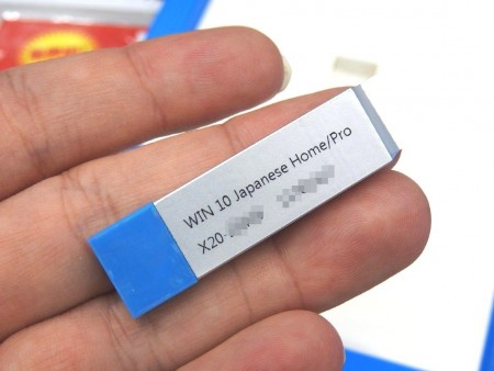 ツクモパソコン本店では、入荷したパッケージを早速開封。内部には「Win 10 Japanese Home/Pro」とプリントされたUSB3.0対応フラッシュメモリのほか、プロダクトキーが記載されたカードが同梱されている。ちなみに容量は約16GBほどで、半分の8GBほど使用。「書き込むことはできなかった」とのこと。