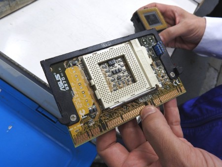 CPUが付いているみたいなので、15年ぶりに外してみましょうか。それにしても・・・固いですね。いまさら壊れる心配もありませんので少々強引にいきます。CPUクーラーとはガッツリ一体化していますが、「S370」からは外れました。CPUは「Celeron 400MHz」ですね。