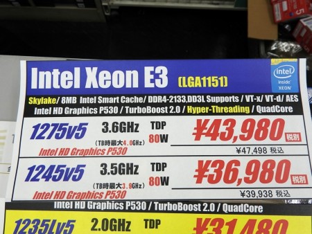 今回販売を確認したのは「E3-1275v5」を筆頭に計7モデル。またTDP25Wや45Wの省電力モデルも順次入荷する予定 | |