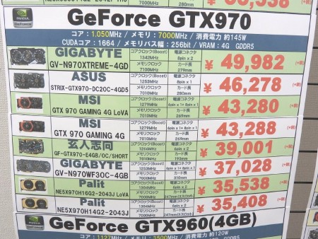極めつけはその価格。税抜35,538円なんですから、もちろん当店最安のGeForce GTX 970搭載グラフィックスカードになります。GeForce GTX 960搭載グラフィックスカードと比べると約1万円の差ですが、十分差額分のパフォーマンスが得られると思いますよ。