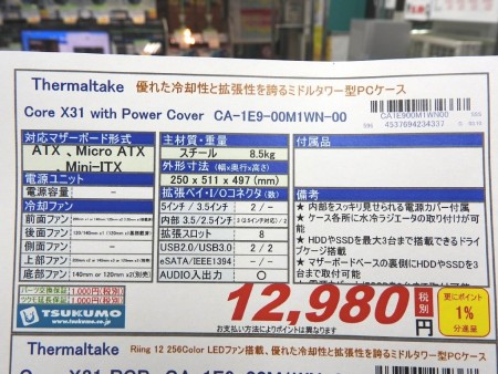 冷却ファンは、フロント200mm×1または120 / 140mm×2、トップ200mm×2または120 / 140mm×3、リア120 / 140mm×1、ボトム120 / 140mm×2で、すべての冷却ファンポートに水冷用ラジエターを搭載可能。特にフロントとトップには360mmの大型サイズも実装できる。販売ショップはツクモパソコン本店とTSUKUMO eX.。