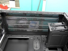 | “フルモジュラー”仕様の内部。拡張スロットは8段で、グラフィックスカードは標準時278mm、HDDラック取り外し時は420mmまで対応、CPUクーラーは全高180mmまでサポートされる | |