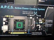 3連装ファンと小型ファンを備えた特異なクーラーで、それぞれのファンが役割を分担してカード全体を冷却する仕組み。123層のアルミフィンと8mm×2+6mm×3のヒートパイプを組み合わせた大型ヒートシンクは3連装ファンが、基板上に実装されたメモリ周りのヒートシンクを小型ファンが冷却するという、「Active Power Cooling System(A.P.C.S)」なる仕組みが採用されている。