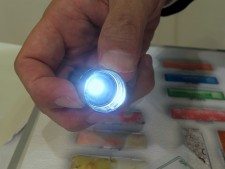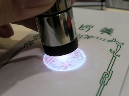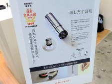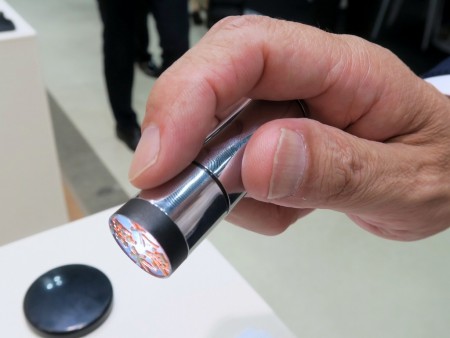 | 天野製作所が出展していたのは、ご覧の通りの“光るハンコ”。内蔵光源が印面を透過して、プロジェクターのように刻印を投影することができる |