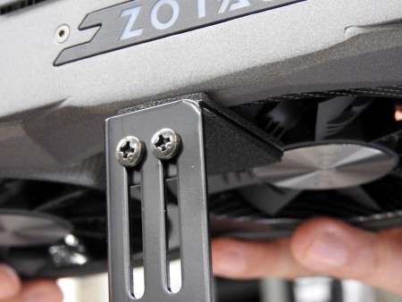 | グラフィックスカードを支えるフックの位置も2本のネジを使い自由に調整することができる |