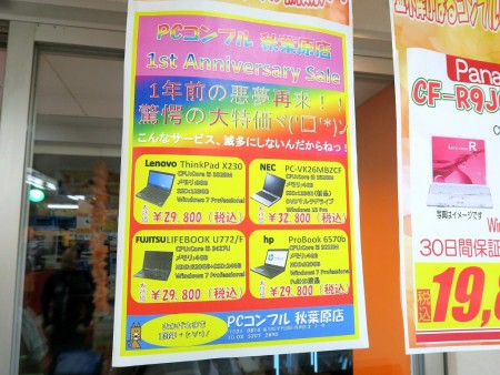 PCコンフルって、結構前からあったよね?なんて言われることもありますが・・・実は今月の29日(土)でようやく1周年なんです!日頃のご愛顧に感謝ということで、ただいまお店では先週末から「1周年記念セール」を開催しております。節目を迎える前でもお構いなし、すでにかなりぶっ飛んだ特価品をたくさん並べてしまいました。近くに来た折には、ぶらりと寄ってみると幸せになれること請け合いです。