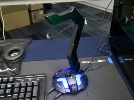 | 先ほどのヘッドセットが置かれていた、ヘッドセットスタンド「X-Rest 7.1」。なんとUSBサウンドを内蔵するという、新発想のユニークなスタンドだった |