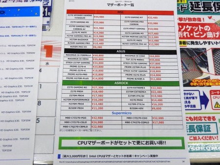 ドスパラ パーツ館(画像左)とツクモ各店(画像右)のマザーボード価格表。詳細レビューをお届けしたASRock「Z270 Gaming K6」やMSI「Z270 GAMING M7」も解禁と同時に販売が開始される | |