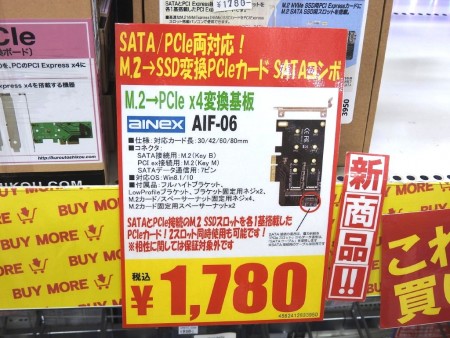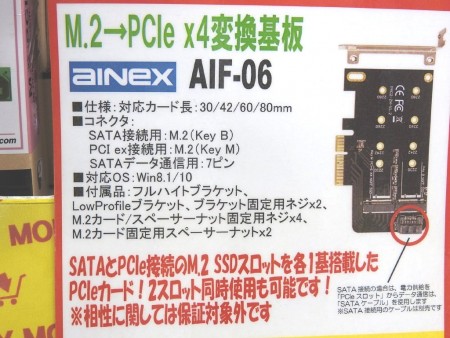先日、当店でも販売を開始したアイネックスの変換カード「AIF-06」が人気です。SATAとPCI-Express接続のM.2 SSDを各1枚搭載可能。バスインターフェイスPCI-Express(x4)に対応し、M.2-PCI-Express変換カードでは最安クラスのコストパフォーマンスも魅力です。