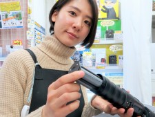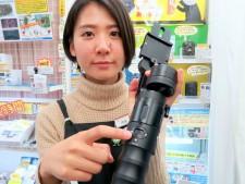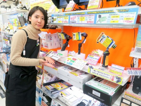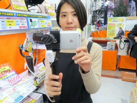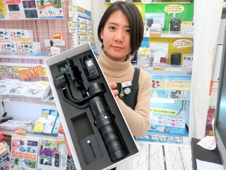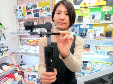 それで「デジタル一眼対応 3軸電動カメラスタビライザーPro」ですが、実は普段は店頭には並んでいません。でもちょくちょく指名買いのお客さんがいらっしゃって、税込98,000円と超高額なのに、それなりに売れていたりします。お手持ちの一眼レフやミラーレス一眼を使った動作チェックも、もちろんOK!実際に試してみて、納得してご購入いただけますよ。