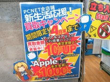 そしてただいま店頭では、中古PCの販売だけじゃなく買い取りも頑張っています。ちょうど新生活が始まるの季節ということで、「新生活応援!買い取りキャンペーン」を実施中!デュアルコア以上のCPUを搭載しているPCなら査定金額が10%アップ、アップル製品なら+1,000円で買い取ります。持ち込むPCは壊れていても大丈夫(アップル製品はデータ消去可能な場合のみ)なので、どしどしお問い合わせください!