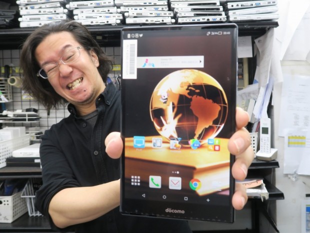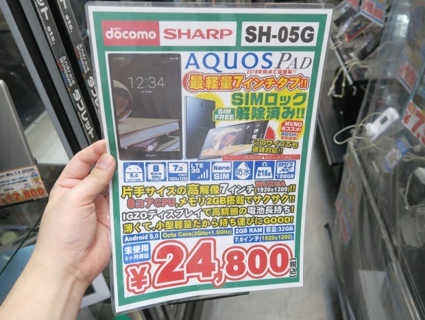 イオシス アキバ路地オモテ店から石山さんがコレオシしてくれるのは、シャープの電話もできる7インチタブレット「AQUOS PAD SH-05G」だ。最近では貴重な7インチの高性能なAndroidタブ、SIMロック解除済みの未使用品が格安でゲットできるぞ。