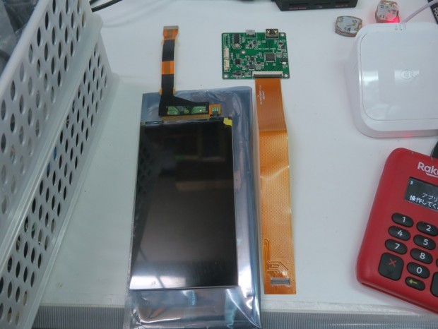 フレキシブルなリボンケーブルでインターフェイスボードに繋がっており、PCとはHDMIで接続する仕様。電源は5VのUSB給電だ。液晶パネル部分の外形寸法は約幅70mm、奥行き128mm、厚さ1.2mm。ノーブランド扱いながら、ショップによれば「シャープ製の液晶を使っていると聞いている」とのこと。