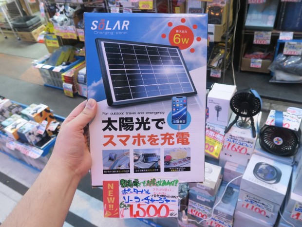 スマートフォンやUSB機器を直接充電できる、格安のソーラーパネル「ポータブル ソーラー チャージャー」があきばお~弐號店で販売中。トーシン産業によるプライズ商品で、価格は税込1,500円だ。