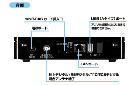 外形寸法は、W180×D150×H85mm、重量約310g。インターフェイスは、地上デジタル/BSデジタル/110度CSデジタル混合アンテナ端子(F型コネクタ)、miniB-CASカード挿入口、LANポート(10BASE-T/100BASE-TX)、USB(Aタイプ)×2(外付けHDD/拡張用)。