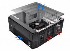 トップ、フロント、サイドパネルの三方を大胆にメッシュ素材で開口する高エアフローMini-ITXケース「SD101」がThermaltakeよりリリース。トップに2100rpm(23dB)の80mm高回転ファンを配置、CPUクーラーとの組み合わせで効率のよい冷却効果を発揮する。