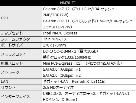 一般的なMini-ITXより厚みを抑えたThin Mini-ITXに対応する小型マザーボードの新製品。チップセットは省電力CPUに対応するIntel NM70 Expressで、CPUはTDP17WのCeleron 807(1コア/2スレッド/1.50GHz/L3キャッシュ1.5MB)とCeleron 847(2コア/1.10GHz/L3キャッシュ2MB)の2モデルが用意される。