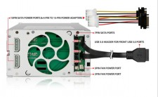 2段の5.25インチベイに3台の3.5インチHDDを収納できるリムーバブルラックの新製品。フロント部にはUSB3.0ハブ機能も搭載され、5.25インチベイを有効活用することができる。