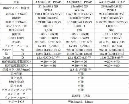 輝度は最高1,100cd/m2、コントラスト比最高1,100:1で、外光の強い場所でも高い視認性を確保。動作保証温度範囲は-20℃~70℃、コントローラインターフェイスはUART、USBで、対応OSはWindows 7、Linux。なお各製品の詳細スペックは以下の通り。