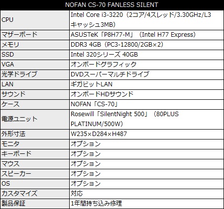 肉厚アルミ素材を採用した煙突型ケースNOFAN「CS-70」を採用したファンレスBTOの新製品。CPUクーラーは、円柱デザインが特徴的なNOFAN「CR-95C」で、電源ユニットには80PLUS PLATINUM認証のファンレスモデルRosewill「SilentNight 500」を搭載させた。