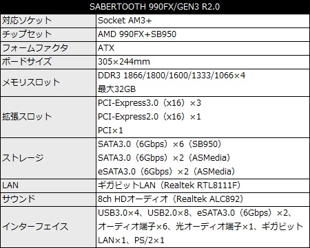 AMD 990FX+SB950チップセットの「SABERTOOTH 990FX R2.0」をベースにした製品で、放熱性能を向上させたセラミックコーティングヒートシンク、軍用規格の高品質コンポーネント、過酷な条件での動作テストにより高い耐久性を実現。また、CPUとメモリ向け電源をデジタル化した「New DIGI+」電源回路を搭載することで、高負荷や負荷変動が大きい環境でも安定動作を可能にした。