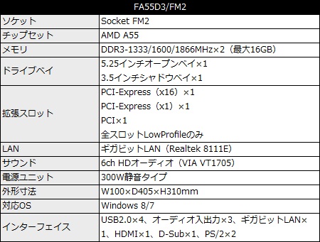 「FA55D3/FM2」は、ブック型スリム筐体を採用したSocket FM2対応ベアボーンキット。マザーボードはオール固体コンデンサを採用したAMD A55チップで、TDP100WまでのAMD Aシリーズをサポートする。